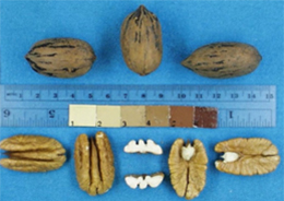 肖尼的親本為Schley×Barton,1968年發(fā)布的品種,選育單位為美國農(nóng)業(yè)部美國山核桃試驗站。堅果的果基、果頂鈍,果殼薄,易脫殼,品質(zhì)優(yōu),單果重7.1克,種仁脊溝窄,出仁率57%,種仁金黃色。雌先型,雌花可授期與雄花散粉期大約在5月初,果實成熟期為10月中旬,抗痂瘡病能力差。